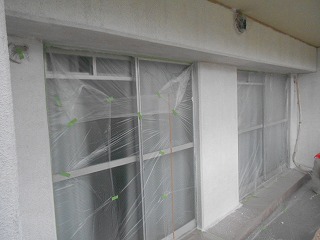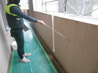 - 南面バルコニー側の下地補修工事、シーリング工事が完了し、1工区より外壁塗装工事を進めています。写真は下塗り材を塗り終えたところです。この後中塗り、上塗りを行います。バルコニーに出入りできなくなっており大変ご不便をおかけしております。下地補修工事、シーリング工事は来週より北面共用部に入ってまいります。引き続きご協力の程よろしくお願いいたします。