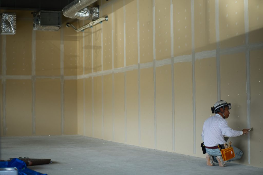 壁を平らにするためにボードの継ぎ目とビス頭を丁寧にパテ処理しています。