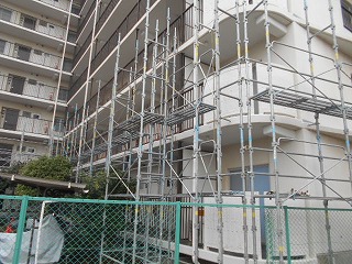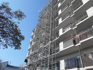 1~2工区の足場が組みあがり、現在は3~4工区の足場組立中です。まもなく組みあがった工区より鉄部塗装や下地の調査などベランダ内での作業がはじまります。ベランダの使用制限が出てきます。配布チラシや洗濯物情報の確認をお願いいたします。