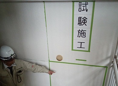 工事が始まって1ヶ月ほどが経過しました。現在共用部廊下などで作業を進めていますが、本格的な塗装工事に先立って、先日「塗装試験施工」を行いました。下塗の希釈率や中塗り・上塗りの状態を確認しました。これから下地補修の他、各種作業に移ってまいります。入居者さまには作業などでご迷惑をお掛けしておりますが慎重に作業を行ってゆきますのでもうしばらくご辛抱頂きます様、宜しくお願い致します。