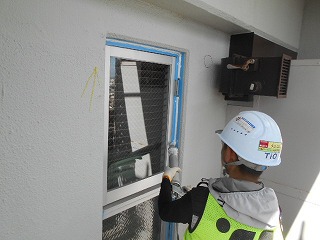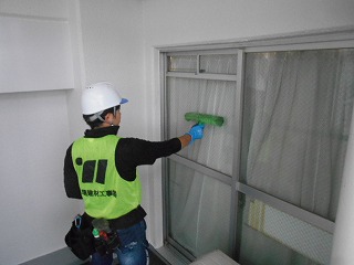 写真は、バルコニー内建具廻りシール打替えの状況です。現在、バルコニー内のシーリング工事はほぼ終わり廊下の建具廻りを進めています。玄関枠廻りも打替えますので玄関出入りの際触れないようご注意ください。引き続きご協力の程よろしくお願いいたします。