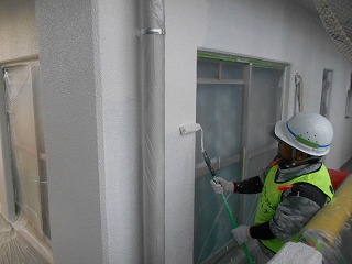 バルコニー面の下地補修工事、シーリング工事が完了し、バルコニー面を半分に分けて外壁塗装工事が始まりました。6日間にわたりバルコニーの使用制限があり、ご不便をおかけしております。また廊下では玄関枠廻り、PS扉枠廻りのシーリング工事を行っています。玄関出入りの際ご注意ください。