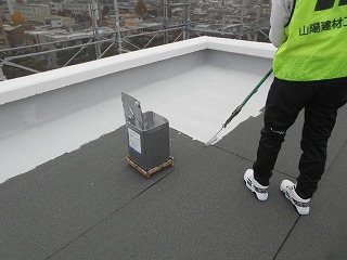 今週で足場の解体がほぼ終わり、足場が建っていて作業のできなかったルーフバルコニーの防水工事を行っています。防水が終わりますと床シートを貼って完了となります。最近になり雨の降る日が多くなり進み具合が心配ですが今しばらくご協力の程よろしくお願いいたします。