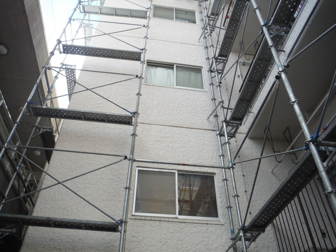 お隣の建物が近く足場が狭く、安全に気をつけて作業を行っております。窓の養生を行い、窓の開閉ができない状態で、洗濯物が干せない状況であったり、居住者様にはご迷惑をお掛けしておりますが、焦りによる事故などがないように安全にも注意しながら作業を行っておりますので居住者様にはご理解ご協力お願い申し上げます。 -