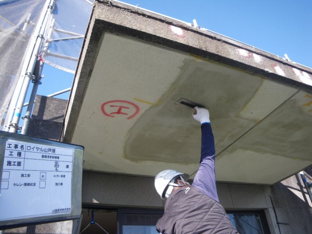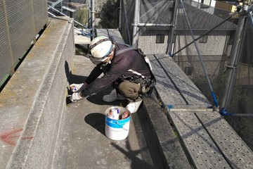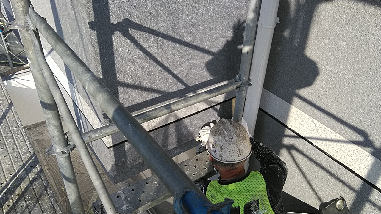 現在外壁において下地補修作業を行っております。天候が安定している間に何とか工事を進めればと考えていますが、なかなかうまくいかない時もあります。不具合箇所が無いかチェックしながらの作業は時間もかかりますが安全重視・品質重視で行って参ります。