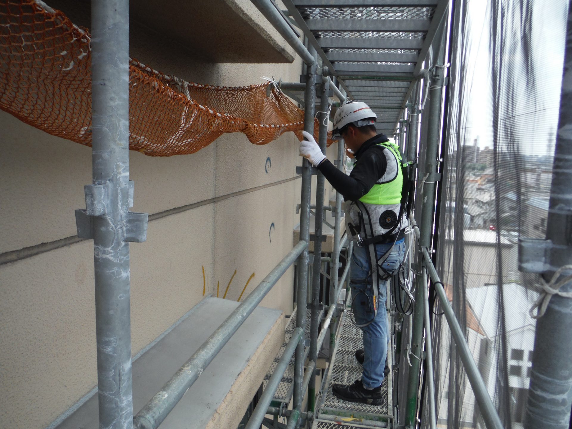 現在、下地調査・補修、シーリング工事などの作業をしています。塗装作業の前の建物状態を修復したりする作業となりますのでしっかり補修をして建物の品質を良くするように施工を行います。