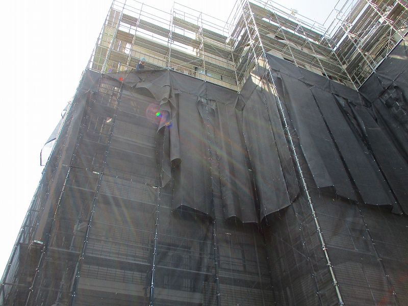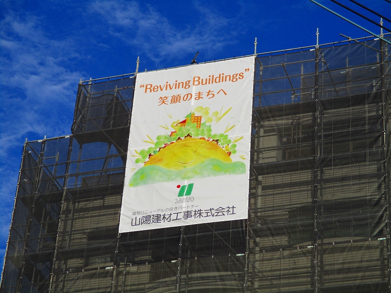 外壁面の足場が完成しました!! 看板シートを鳶工さんにお願いして取り付けてもらたので皆さんも外から見上げてみてください。