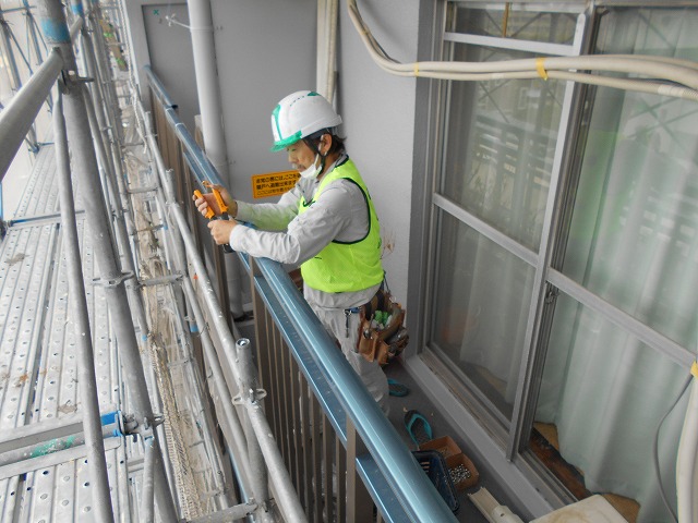 だんだんと真夏のような暑い日になってきました。みなさん熱中症には充分注意してくださいね。現場も熱中症に充分気をつけ安全第一で工事を行っております。さて、本日からバルコニー手摺取り付け工事が始まりました。手摺が付くとだいぶ画も変わって行き完成がワクワクしてきます!これから数日間取り付け工事が続き住民の方には洗濯物など、ご迷惑お掛けしますが引き続きご協力の程よろしくお願いします。