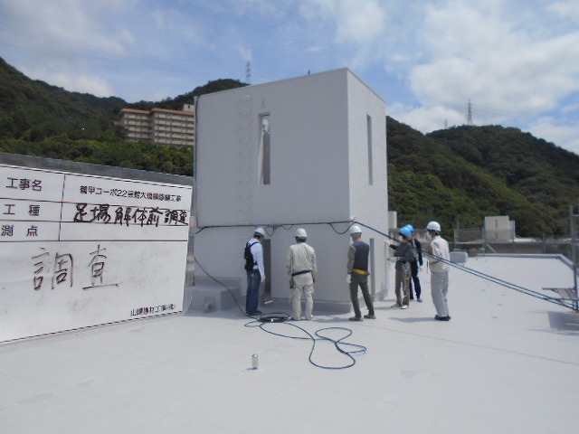 先日、6月20日(土)に管理組合の方々に足場の上から工事の完了状況をご確認頂きました。写真は屋上防水工事を現地確認しているところですが、念のため足場へ乗るための保険にもご加入頂きました。普段見る事の少ない屋上防水や外壁アロン防水など各所施工の出来栄えを見て頂きました。工事も終盤に差し掛かり引き続き安全第一で最後まで気を抜かず行って参りますので宜しくお願い致します。