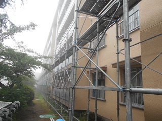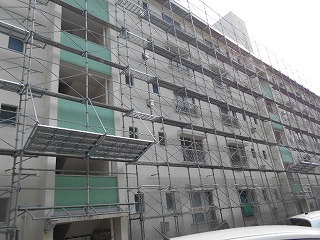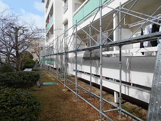 南面、西面の足場は完了し現在北面、東面の足場組立中です。来週の半ばには完了予定です。3月18日(水)よりバルコニー手摺のボード取替え工事、雨水竪管の取換え工事等バルコニー内の工事が始まります。バルコニーの使用制限がありますので洗濯物情報、案内チラシのご確認をお願い致します。