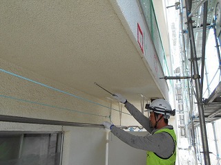 外壁の調査を行い痛んでいる個所をマーキングし補修工事を行っていきます。現在バルコニーでは雨水竪管取替えの為、ドレンの斫り工事を行っています。皆様には騒音と振動でご迷惑をおかけしております。あと10日間ほどで騒音と振動が出る工事は終わる予定ですのでご協力の程よろしくお願いいたします。