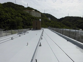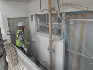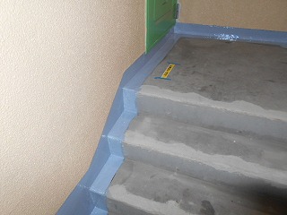 先日、バルコニー面の美装が終わりバルコニー側の工事は全て完了致しました。現在は屋上防水工事と階段室の巾木と側溝の防水工事を行っています。通行の際は足元にお気を付けください。又最上階では騒音と振動があります。ご迷惑をお掛けいたしますがご協力の程よろしくお願いいたします。