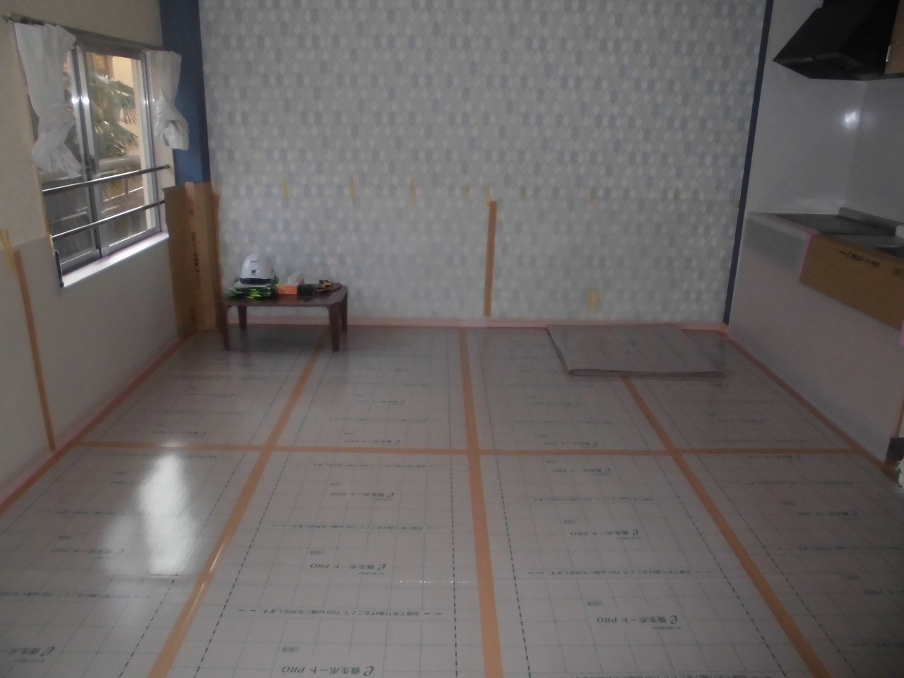 オーナー様のご厚意で、現場事務所として借用するお部屋の養生風景です。