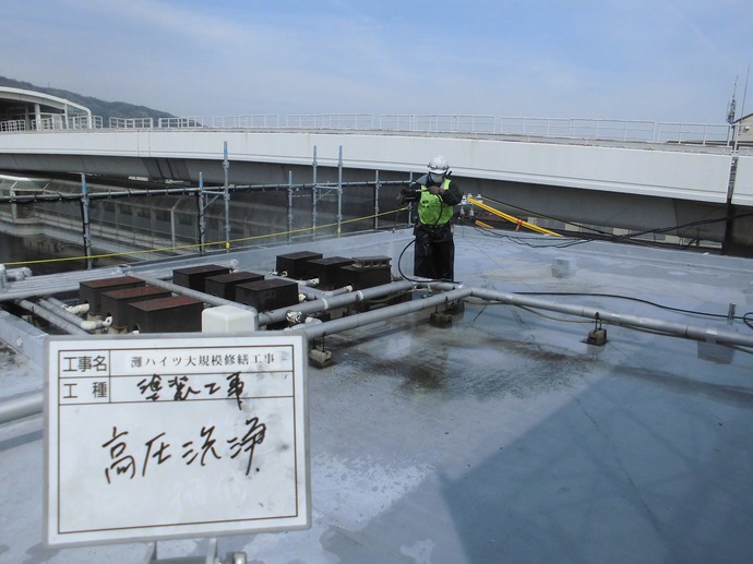 本日は、屋上及び北西面(上階)の高圧洗浄を行いました。