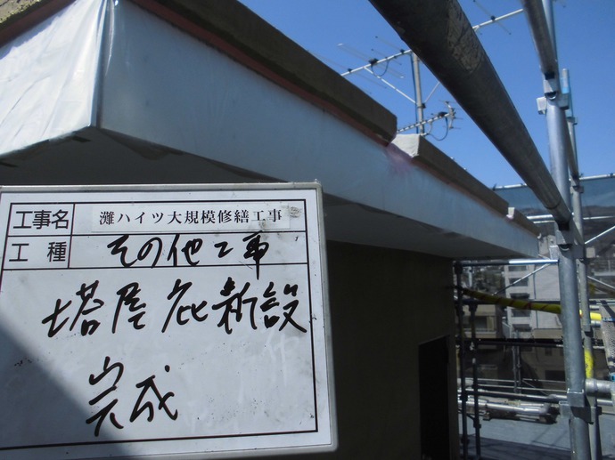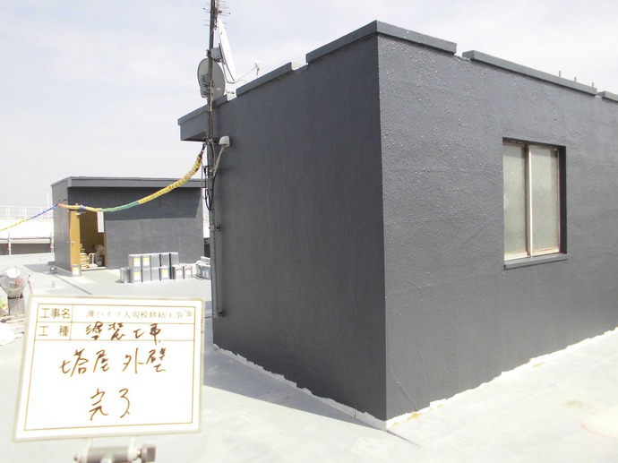写真にありますように、先週までに屋上塔屋の塗装が完了しました。