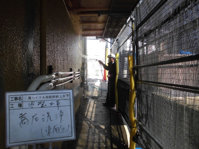 音の出る作業も幾分少なくなってきましたが、明日から2日間は塗装工事の第2ステップ 「高圧洗浄」 を行います。