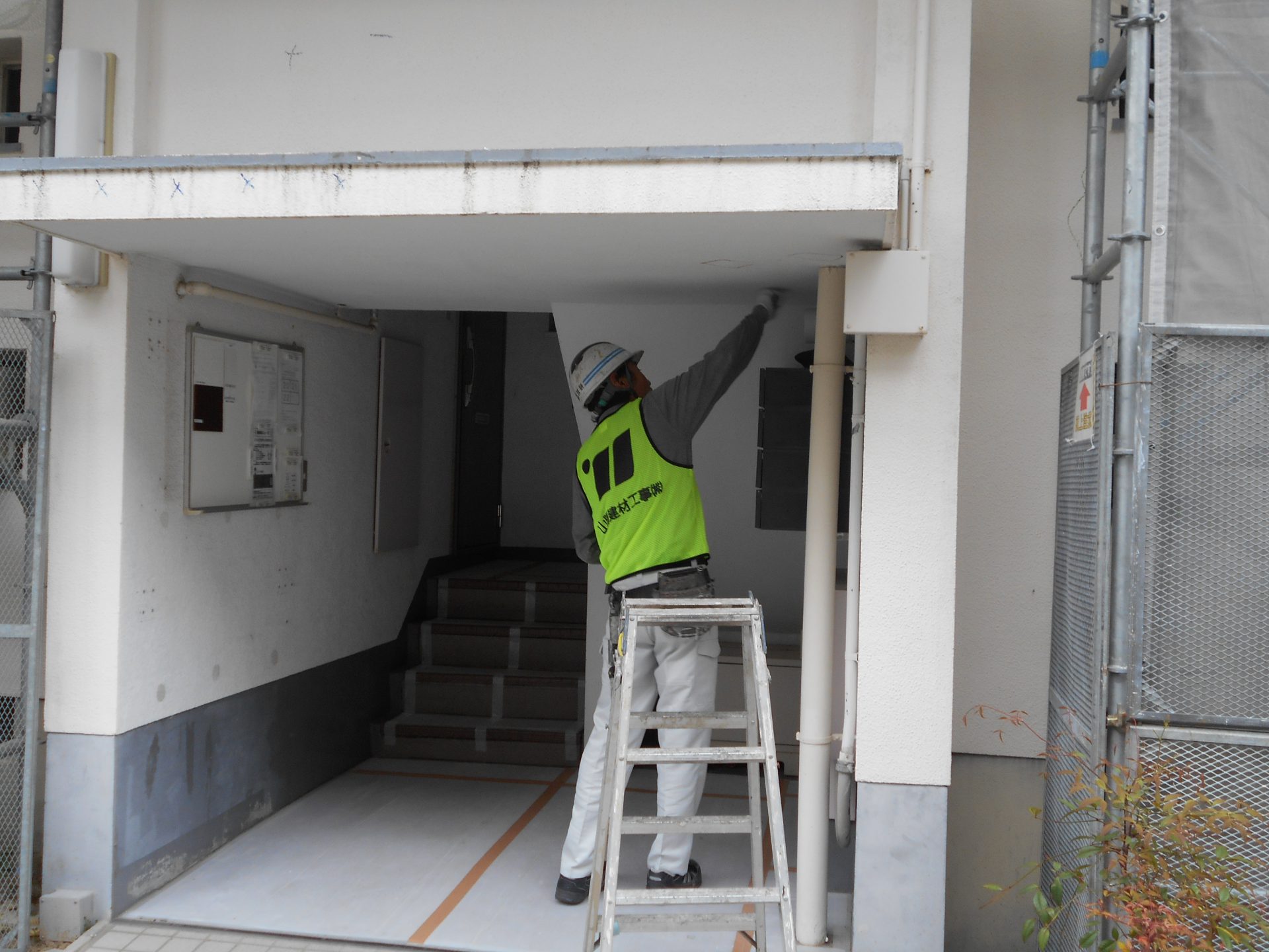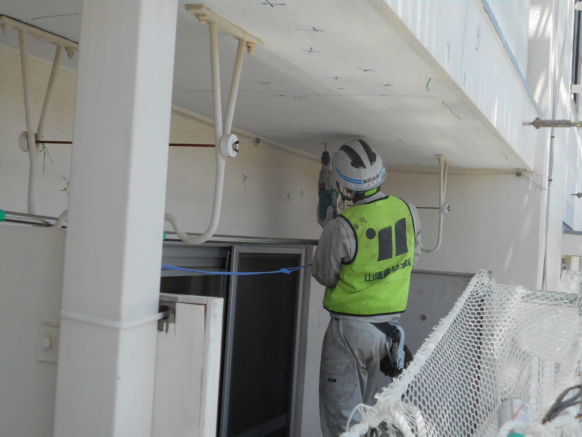 外壁調査の結果を考慮して補修工事に着手しました。躯体コンクリート~モルタル及びモルタル~外壁仕上材の経年劣化の度合い応じて、補強・補修を行なっていきます。この先も、騒音・埃・シンナー臭等でご不自由をお掛けしますが、ご協力宜しくお願い致ます。