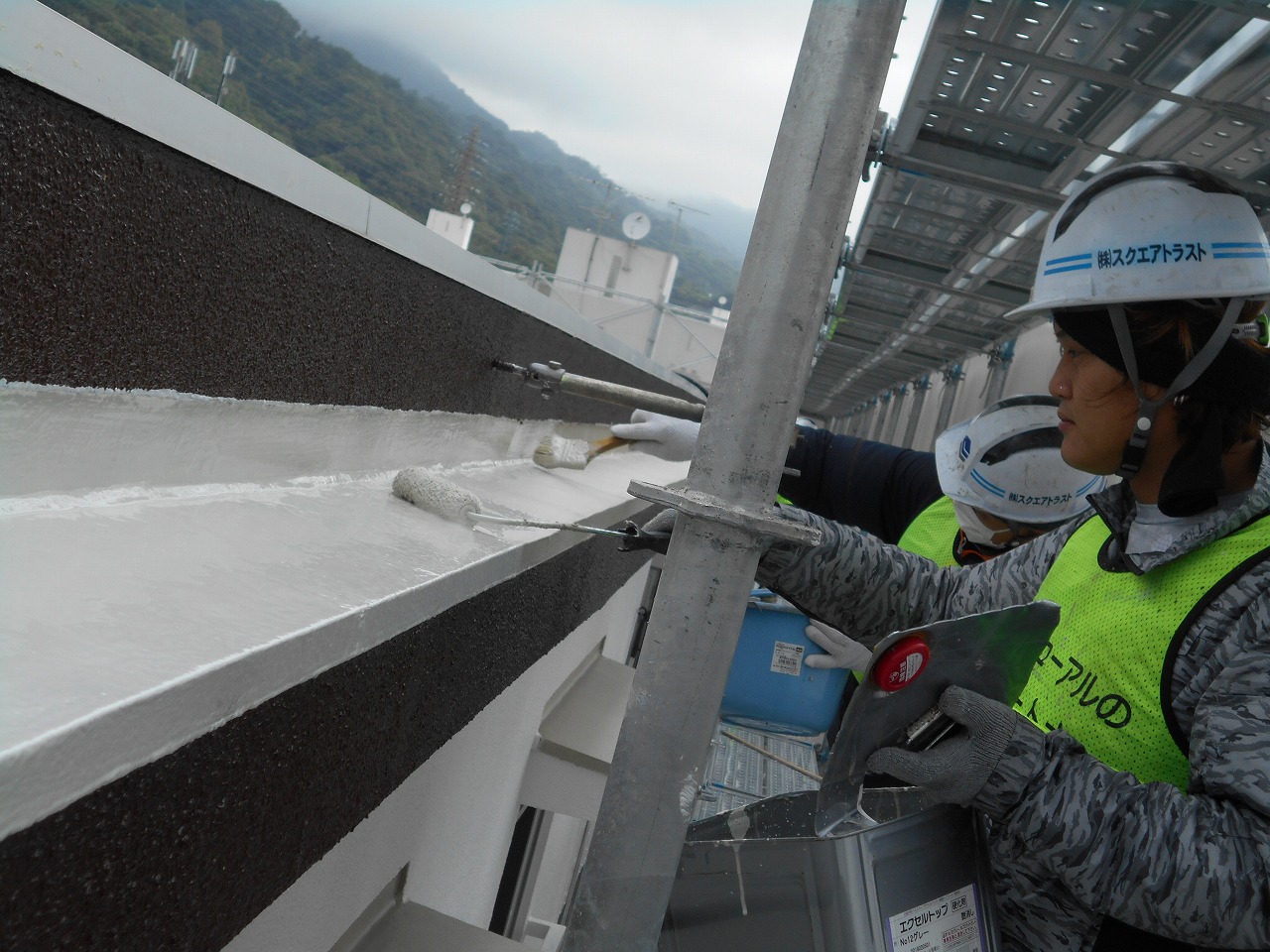 進めております。天候を確認しながら、各階の「小庇」・最上階の庇のウレタン防水の作業中です。「洗濯物情報」の確認がまだ必要です。もうしばらくご協力・ご辛抱をお願い致します。 -