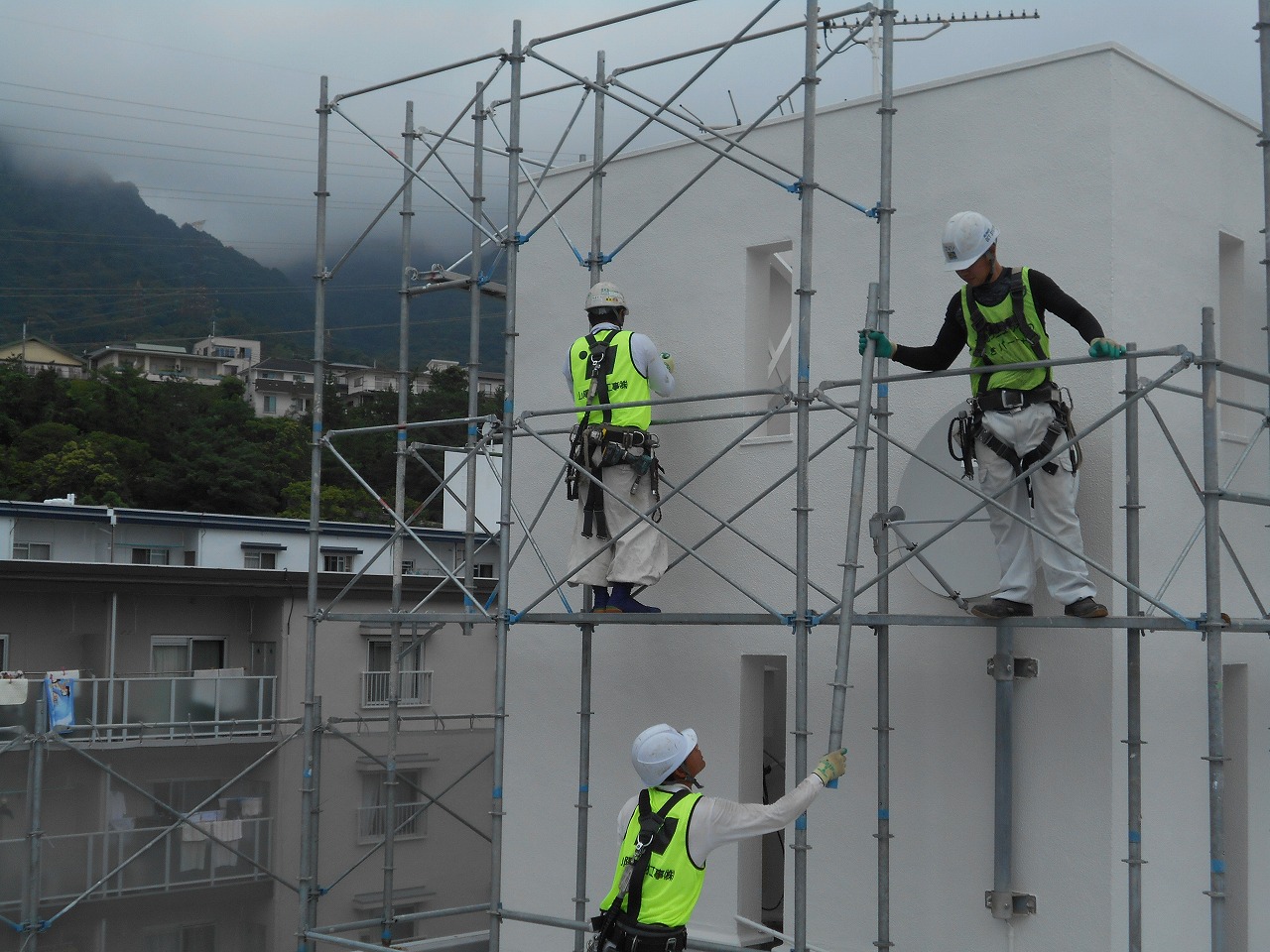 外部足場の組立が完了しました。来週からバルコニーを含む外壁の調査工事(上階より開始)に掛かります。今週の始めよりバルコニー内の片づけをお願いしておりますが、手に余る様な事案等があれば、早めにご相談下さい。