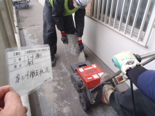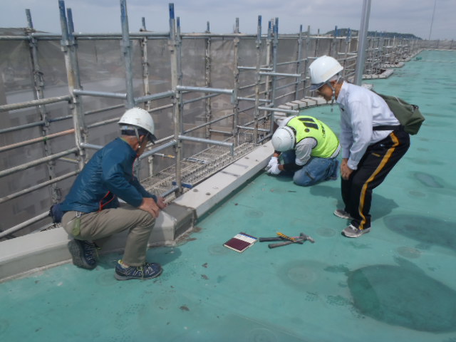 天候がハッキリせずしないせいで屋上防水開始が一日遅れましたが、本日より、立上り部分撤去作業に入りました。撤去状況をご覧いただく為、管理組合の理事様の代表2名が屋上にて作業の確認をしてもらいました。これから本格的に屋上防水をしっかり施工していきます。引き続きのご協力を宜しくお願い致します。