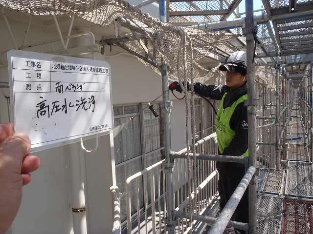 外壁の塗装前高圧水洗浄作業を実施しています。ベランダでの作業も1工区塗装工事へと移っていきます。窓廻りをビニール養生で塞ぎます。天候にもよりますが約1週間程度ベランダ使用が出来ません。ご不便をお掛けしますがご協力宜しくお願い致します。