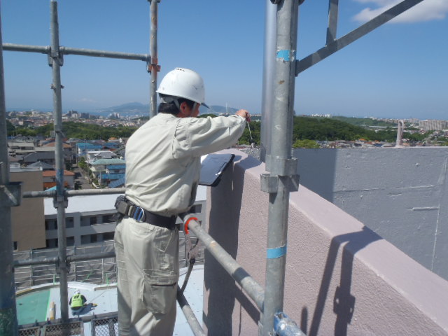 いよいよ足場解体が近づいてきました。各所塗装・防水箇所の品質をチェックする為、足場解体前検査を受けました。手直しなどで再度ベランダへ入らせて頂く場合があります。もうしばらくごご協力お願いいたします。
