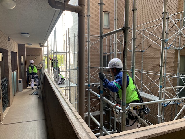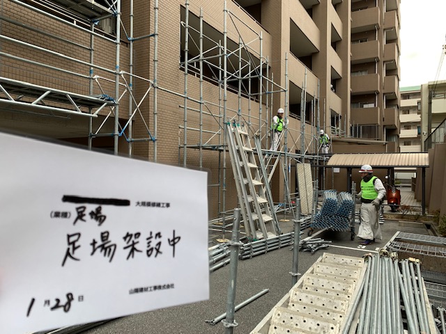 本日は少し暖かく昼からは作業日和になりました。さて、足場は現在スロープ部分を架設中です。居住者様の安全を第一に気を付けて進めて参ります。