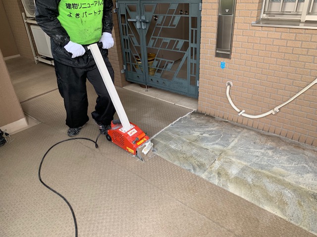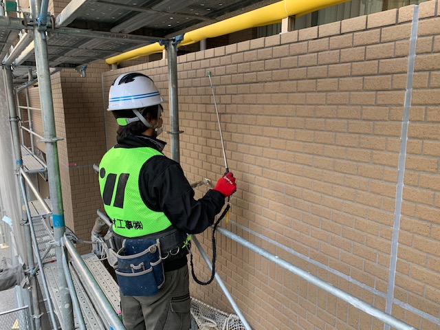 本日現場周辺の最高気温が17度と、とても快適に作業を進めています。さて、現在、タイル浮き部分にエポキシ樹脂注入作業を行っています。注入後、浮きが残っていないか点検しながら進めています。しばらく振動音がし居住者様には大変ご迷惑をお掛け致しておりますが、ご理解・ご協力の程、宜しくお願い致します。
