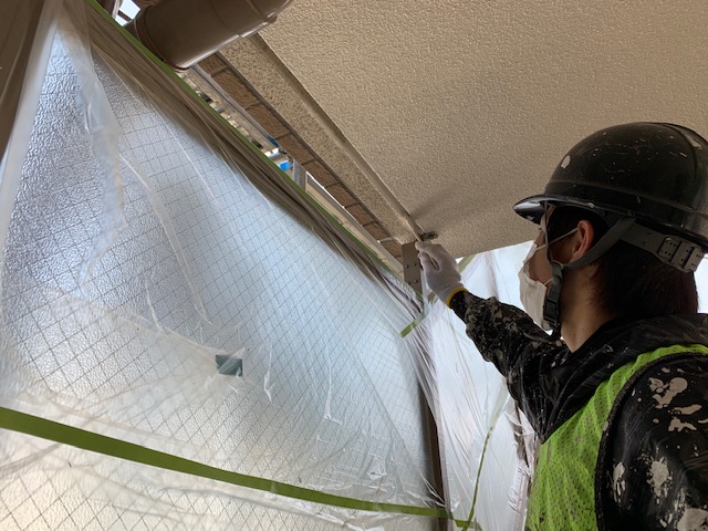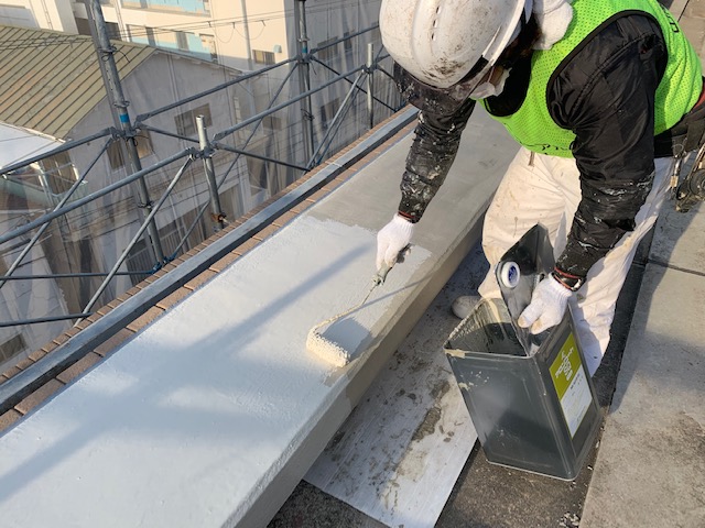 作業員の約6割が花粉症であり、それぞれ対策をして作業を進めております。さて、現在パラペット部を、1級防水施工技能士(アクリルゴム系塗膜防水工事)によるアロンコートSQ防水作業を行っています。水性なので臭いがなく、高品質・高耐久性のある防水材ですので、長きに渡り漏水からシャットアウトします。