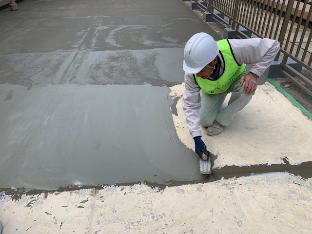 現場近くの桜が徐々に咲きだし、満開になるのが楽しみです。さて、現在ルーフバルコニー床を左官工事にて平滑にしています。次に塗膜防水工事の上、長尺シート工事を行いますので、宜しくお願いいたします。