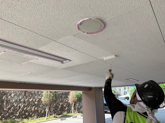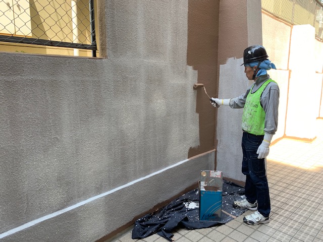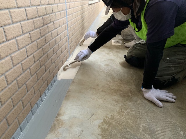 杉花粉の後に檜花粉が舞い散っている中、現場は順調に進んでいます。さて、写真は解放廊下のタイル壁巾木にウレタン塗膜防水工事を施工しています。ご通行の際にはご注意くださいますよう、宜しくお願いいたします。