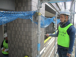 現在、東面の外壁タイル及びバルコニー内の美装を行っています。南面に関しては監理者の検査を受け手直しを行いました。皆様にはバルコニー内の施工確認アンケートを実施しております。足場の解体が近づいておりますが最後まで無事故で進めていきたいと思っておりますのでご協力の程宜しくお願い致します。