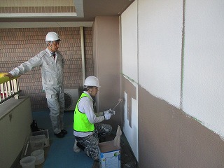 下地補修、タイル補修工事が完了しました。騒音や振動等でご迷惑をおかけ致しました。来週より外壁塗装工事に入りますが先日、塗装の試験施工を監理者、メーカー立会により塗布量や色の確認を行いました。今後、バルコニーに出られない日が続きますので洗濯物情報の確認をお願い致します。
