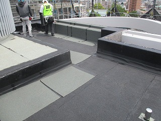 屋上防水工事中。