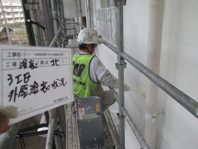 さて現在、3工区の外壁アロン塗装と2工区の下地補修を行っております。今週末、ベランダを高圧洗浄し、来週から1工区のベランダ塗装の予定です。