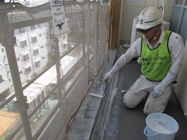 さて、連休明けからベランダ側溝の防水作業を行っております。この後、後続工事でシート貼り→手摺取付工事が続きます。施行中は入居者様のベランダへの立ち入りが出来なくなります。