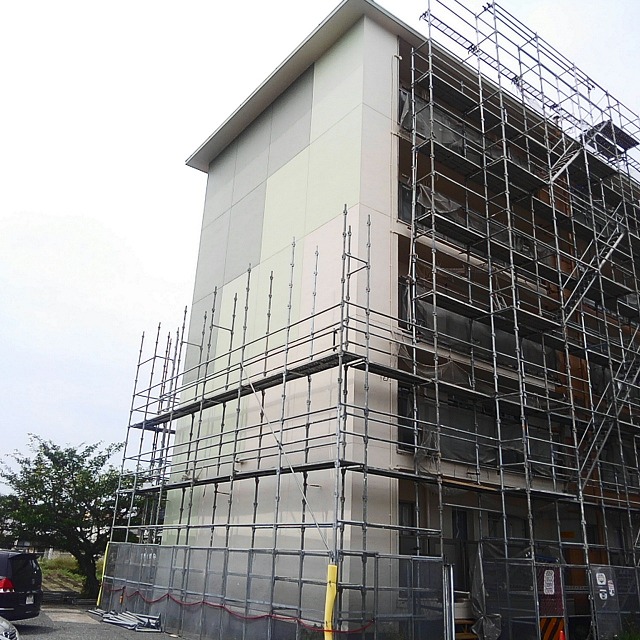 さて工事は、現在外部足場組立て作業をしております。振動や騒音等、入居者の皆さまにはご迷惑をお掛けしております。お洗濯物を干せない日がありますので、洗濯物情報をご確認頂き、ご理解、ご協力の程何卒お願い致します。 -