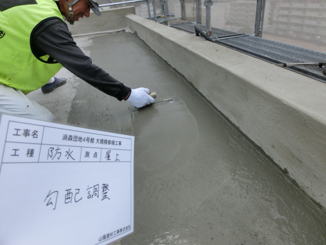 雨水がドレンに流れず溜まっている場所をドレン側に勾配をつけて水が溜まらずドレンに流れやすくなるように施工しているところです。