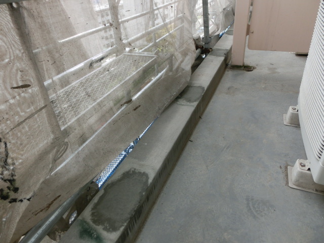今週から、南面半分のバルコニーの防水工事が始まりました。バルコニー内は今、青一色となっております。一度ご覧ください。作業が終わり次第続いてもう半分の防水工事に取り掛かります。