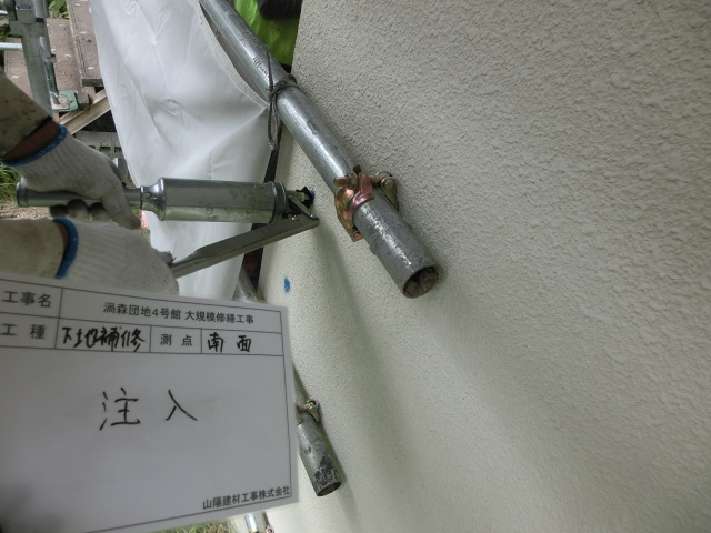 いつも当大規模修繕工事にご理解とご協力頂き誠に有難うございます。写真は下地調査時に確認しました、外壁の不良箇所(浮き部)に削孔を行い剥落を防止する為、樹脂材を注入している状況です。