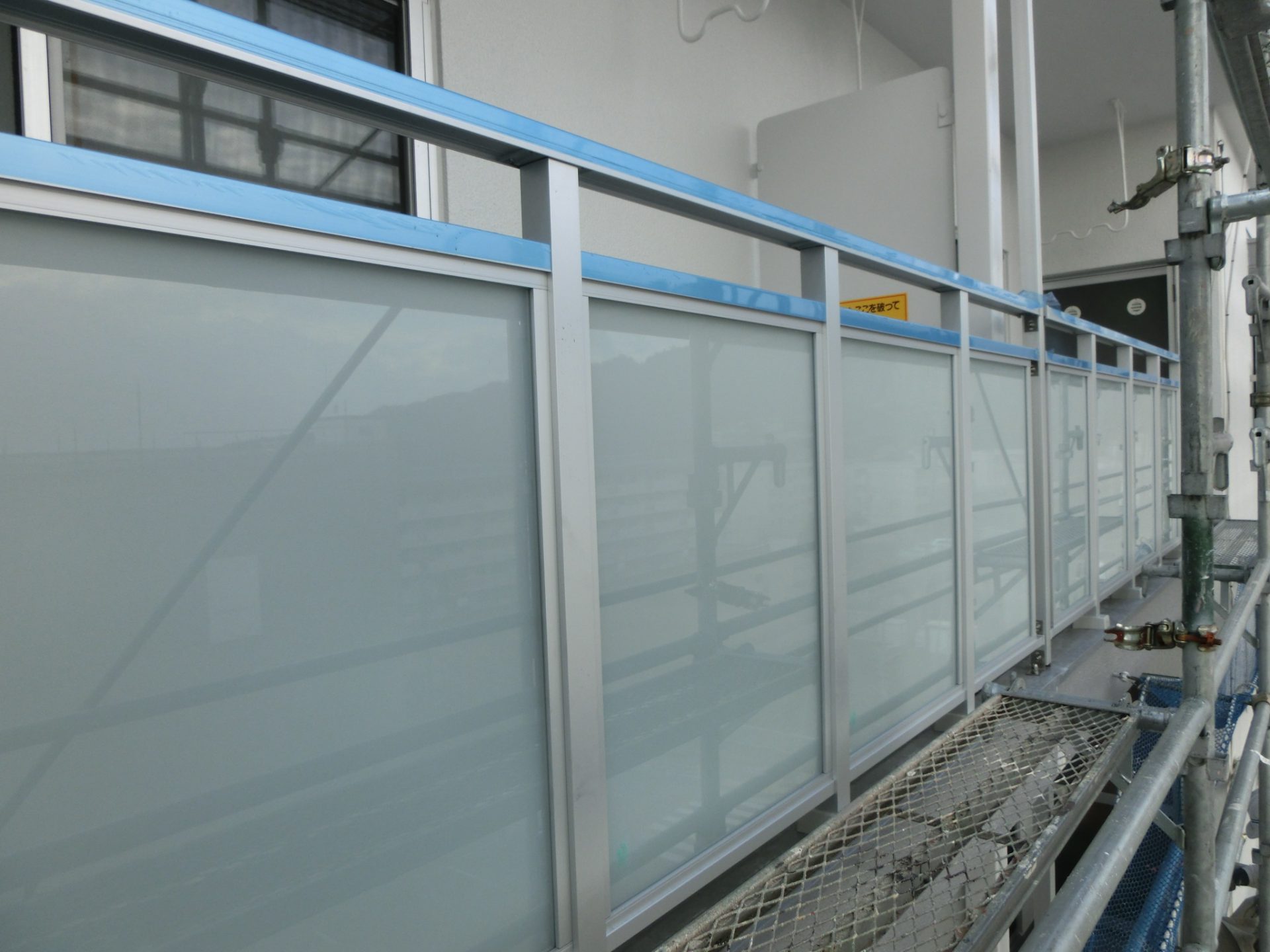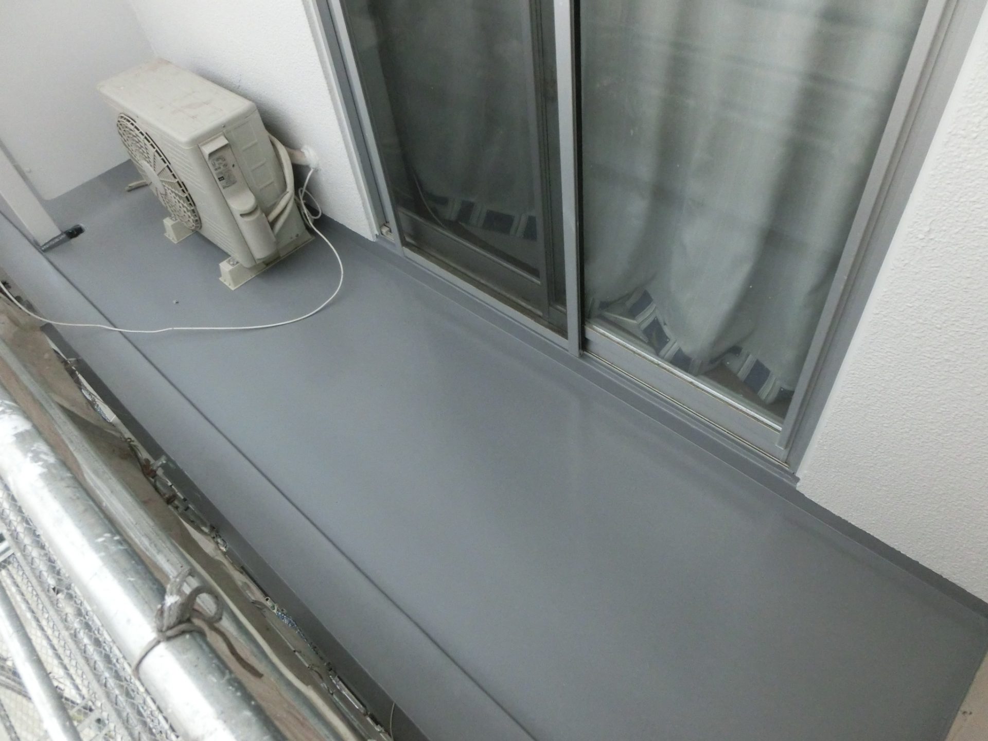 バルコニーの防水工事の進捗です。真っ青だったバルコニーにトップのグレーが塗られて落ち着いた装いとなりました。気分を新たにバルコニーへ出てみてください。