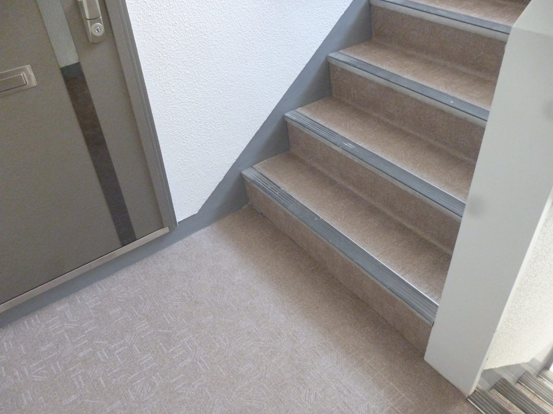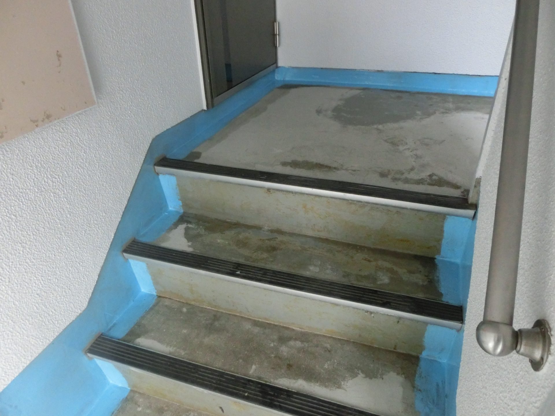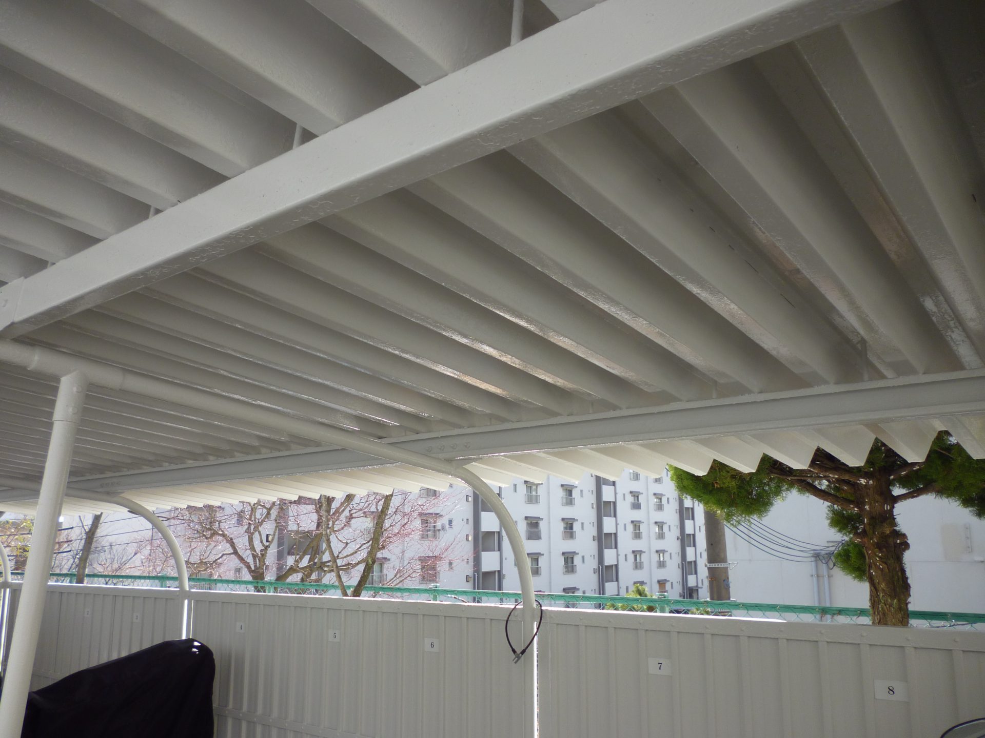 並行して行っているのが、各階段室の手直しと、西面にある駐輪場の塗装工事です。ケレン清掃の後は塗装に入ります。バイクを駐車中の方には移動をお願いしております。