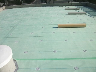 現在、屋上を半分に分け工事を行っています。写真は絶縁シートを敷きディスク版を取り付けたところです。ディスク版を取り付ける際ドリルで下穴を開けアンカーで固定しますがその振動と騒音が階下のお部屋には特に響きます。ご迷惑をお掛け致しますがもうしばらくご辛抱、ご協力の程宜しくお願い致します。