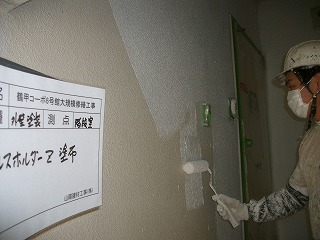 階段室の壁と天井の塗装工事が間もなく完了いたします。通行の際ご不便をおかけしております。17日(木)より玄関枠の塗装に入りますがご在宅が必要になりますのでご協力よろしくお願いいたします。引き続き屋上防水工事、手摺の取付工事を行ってまいります。