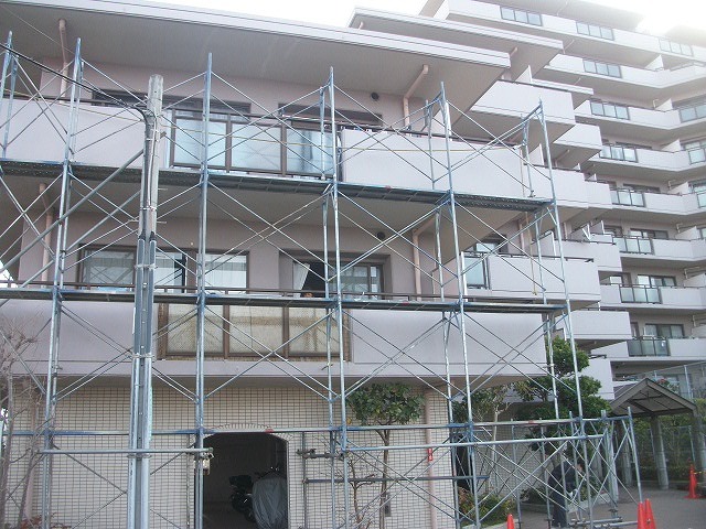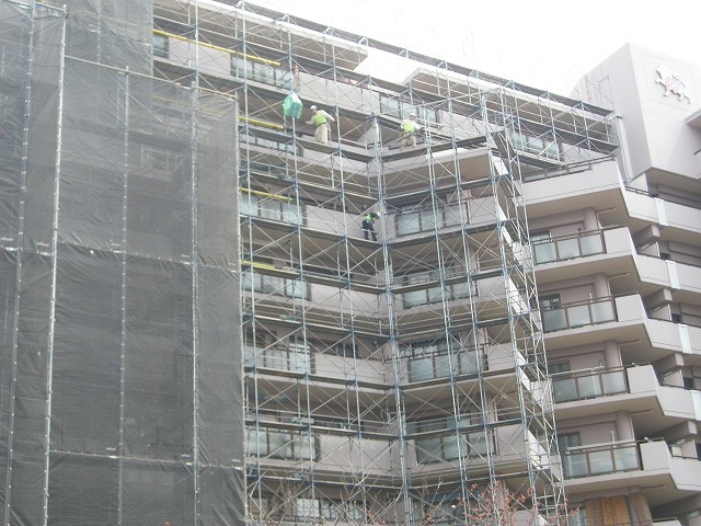 南バルコニー側の足場が約半分組み上がっています。来週から下地の調査と鉄部のケレン錆止めの作業が入ってまいります。寒さも和らぎ仕事のしやすい季節になってきましたが緊張感を持って安全第一での作業を行ってまいります。