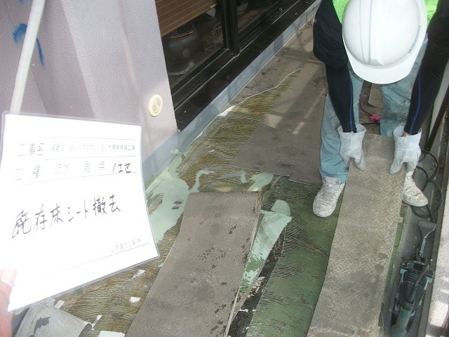 今週からは長尺シート張りが1工区ベランダにて作業を開始しており、作業員がベランダに出入りさせて頂いております。