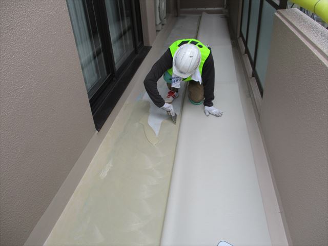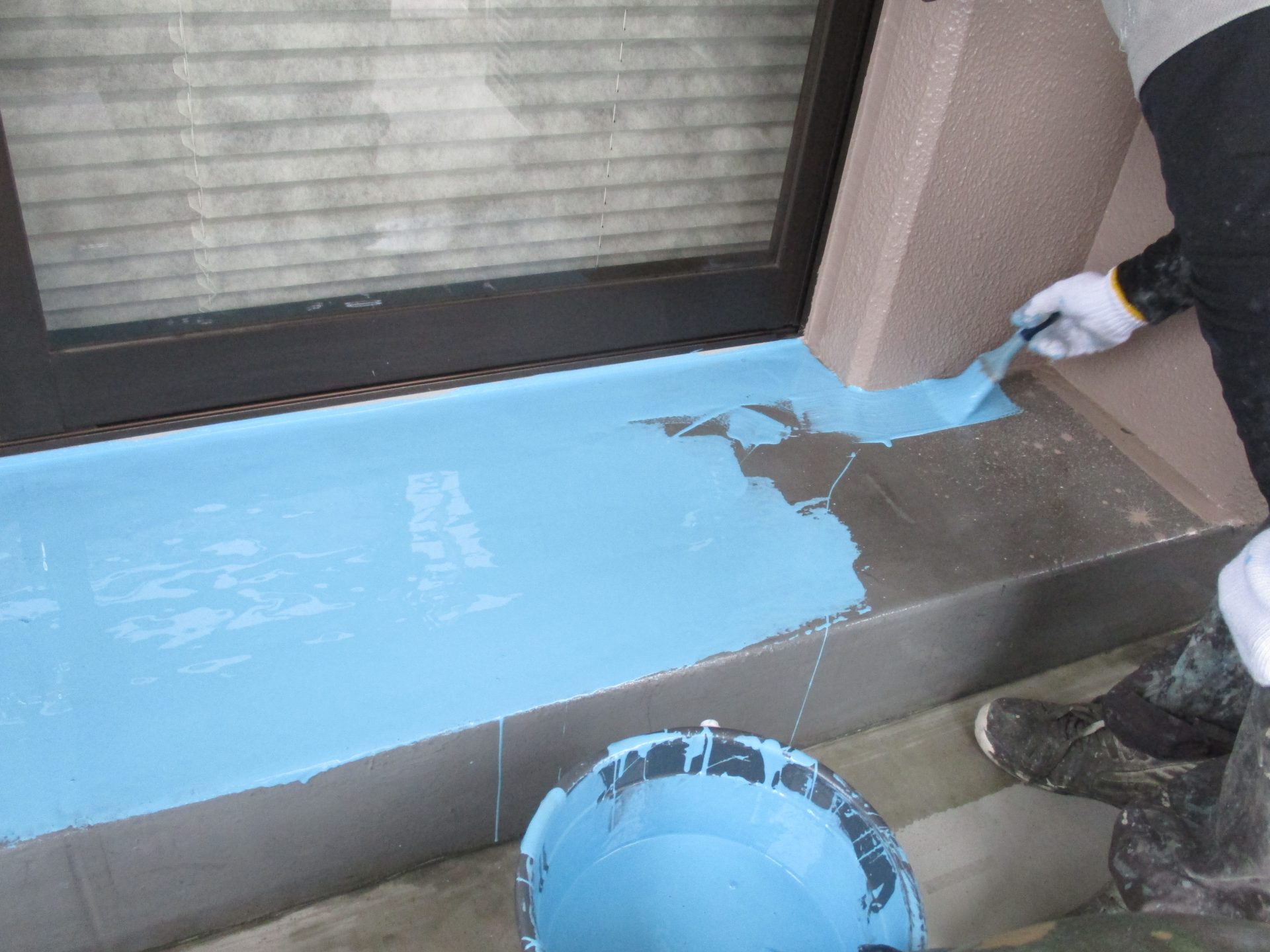 バルコニー内の塗装作業も進み、今週から順にバルコニー内土間の防水作業を行って参ります。