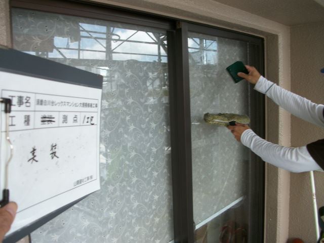 現在、2工区・3工区に置いて窓周囲のシーリング切り取りと充填作業を行っています。床のシートめくりも継続中で皆様には騒音と振動でご迷惑をお掛けしております。あしばくみたても最終工区に入りようやく先が見えてまいりました。なおルーフバルコニー内にも足場が立ちますので出入りの際には置きお付け下さいますようお願いいたします。