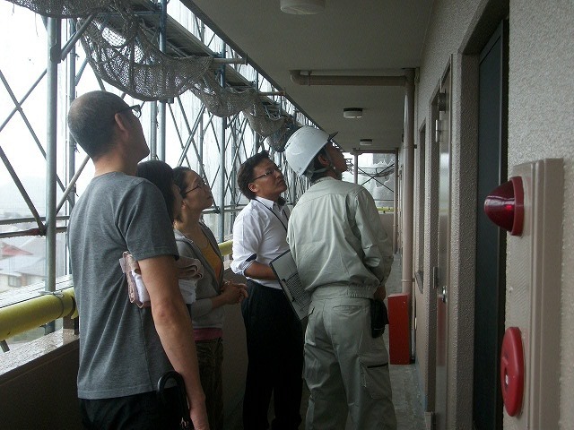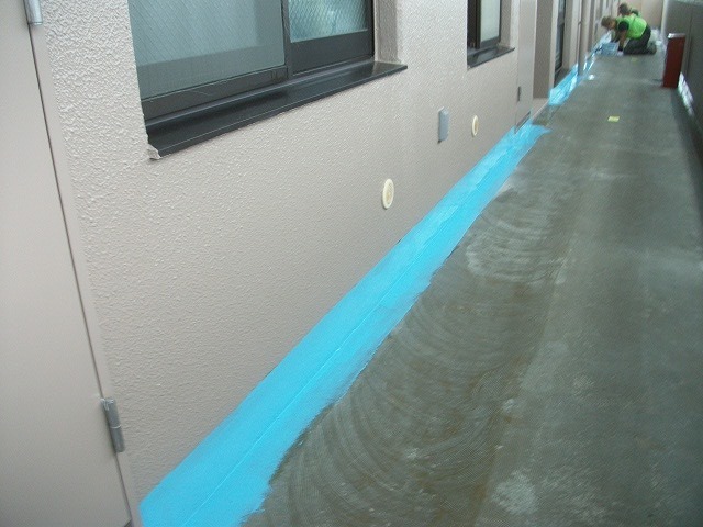 現場確認日とうじつは、あいにくの雨模様となり廊下側の確認となりました。何点かご指摘をいただきましたところは廊下作業終了後、検査を行い是正を行って枚います。工事の方はバルコニー側の工事もほぼ終わり週半ばからセットバック部分の足場を解体しルーフバルコニーの防水工事に入ってまいります。また、廊下側も上階より側溝と巾木の防水工事に入っています。注意の貼紙をいたしますが
