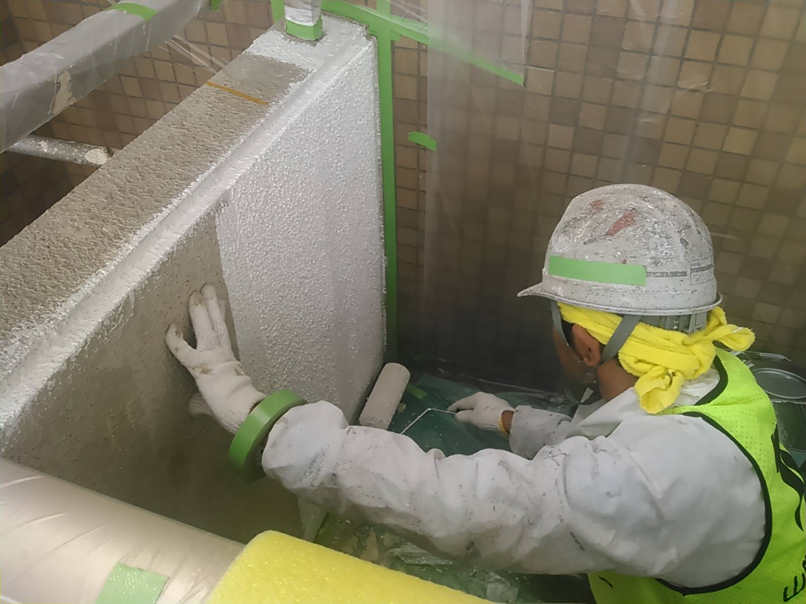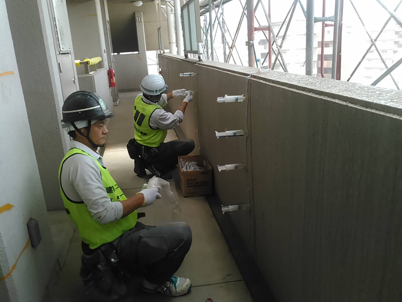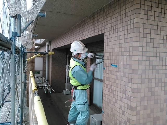 現場は現在下地補修工事・タイル工事・シーリング工事と工事可能な箇所から施工を行なっております。騒音を伴う工事も今がピークといったところでしょうか。入居者の皆様には今しばらくご辛抱いただき安全に工事を進めて参りたいと思っています。ご協力宜しくお願い致します。